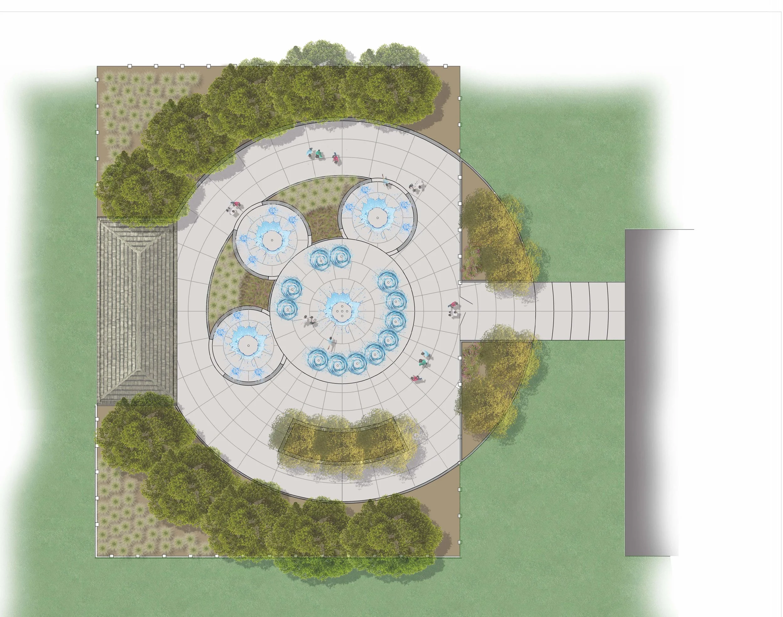 Canton Borough had not used its pool in nearly two years since closing the facilities due to disrepair. The facilities had not seen any maintenance since 2012, with the pool itself being over 70 years old. The Borough approached GreenHaus about removing the pool and replacing it with a sprayground facility. The design featured completely removing the existing pool structure, mechanicals and surrounding paving and replacing it with a modern sprayground that is completely accessible to all. Connections were made into the adjacent parts of the park, including ADA parking facilities. Adjacent planting areas were used to manage stormwater, including 3 small rain gardens.
